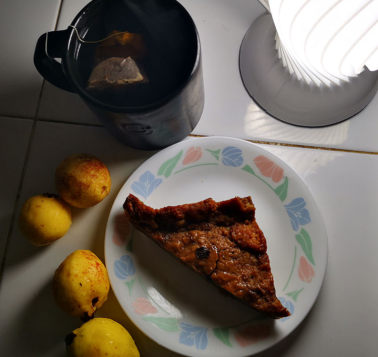 Гуава. Чай. И панке (panque) (пирог/кекс. Видимо, специфически мексиканский, похож на густой-густой пудинг, я его обожаю. Из чего сделан – хз. Покупной).