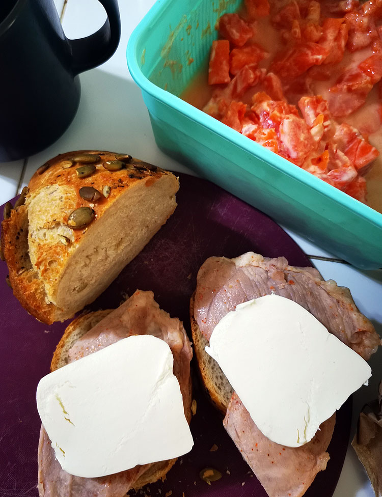Салат из папайи. В бутербродах: пшеничный хлеб с семенами; сыр моцарелла, вчерашнее холодное мясо “на планче”. Обожаю вчерашнее холодное мясо на бутербродах.