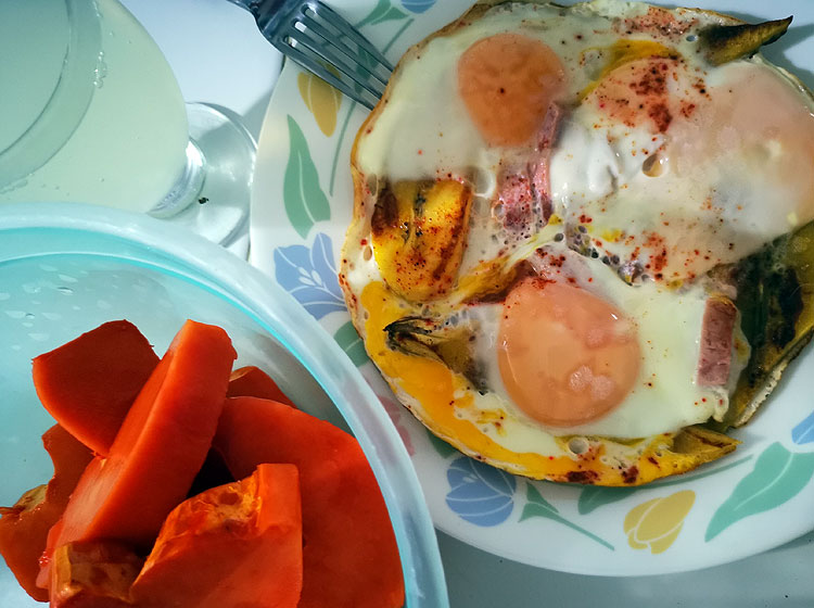Папайя, лимонад (в воду выдавить сок лайма, можно подсластить), яичница с ветчиной и бананами.