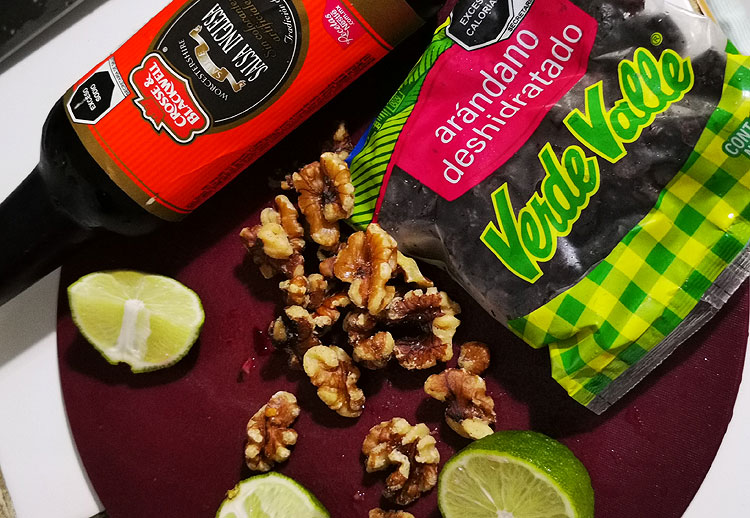 В качестве “изюма” – сушеная черника. В заправку кроме сока лайма – вустерский соус.