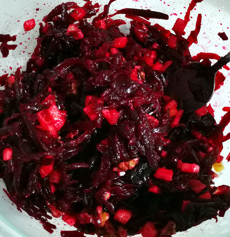 Свеклу отварить – натереть на терке. Яблоко (столько же штук, сколько свеклы) – натереть на терке. Зубчик чеснока натереть на мелкой терке или пропустить сквозь чеснокодавку. (Чеснок тут обязательно!).