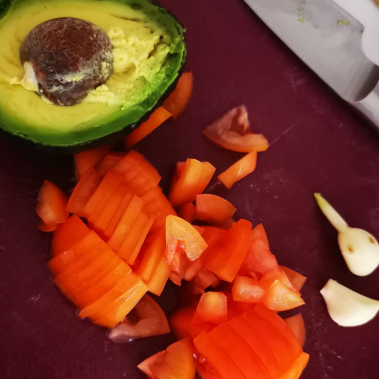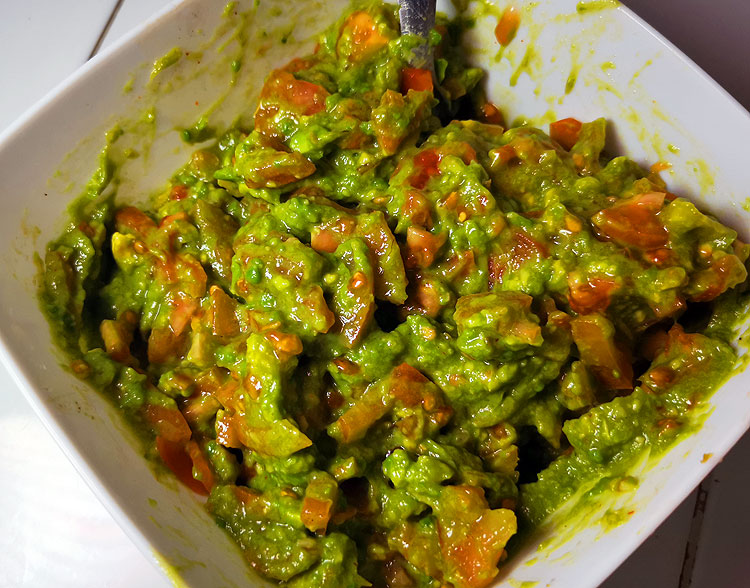 Авокадо размять вилкой. Помидоры (в два раза больше, чем авокадо) нарезать мелко. Чеснок – сквозь чеснокодавку. Плюс соль и перец чили по вкусу. Плюс немного сока лайма.