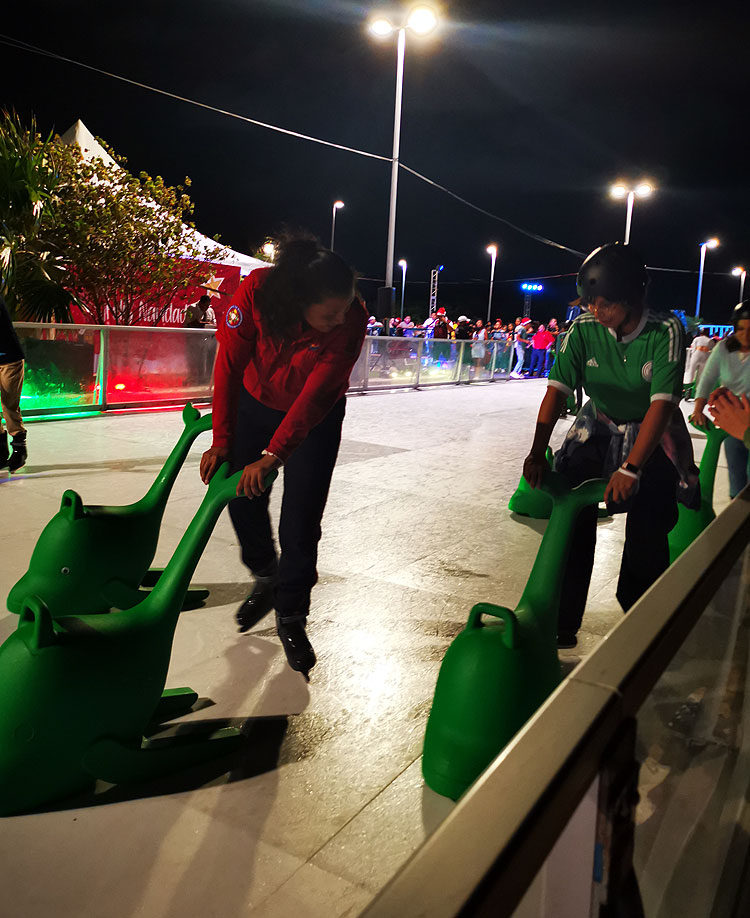 В Мериде мы видели катки в Торговых центрах (наподобие как в Омске в Меге). И там 99% всех, кто катался – были с моей точки зрения профессионалами. Всякие дорожки, езда задним ходом, даже какие-то прыжки выполняли, и видели даже парочку парных поддержек, когда девочка над головой. Круглый год в городе на набережной много роллеров, которые катаются очень классно. При этом на вот у нас открыли городской пластиковый каток – и все ездят с игрушками поддержки. ))) Почему им не помогает их опыт на роликах – я не знаю. (Фигурных коньков тут, кстати, нет, все какие-то странные, типа хоккейных, но тоже не хоккейные, по-моему).