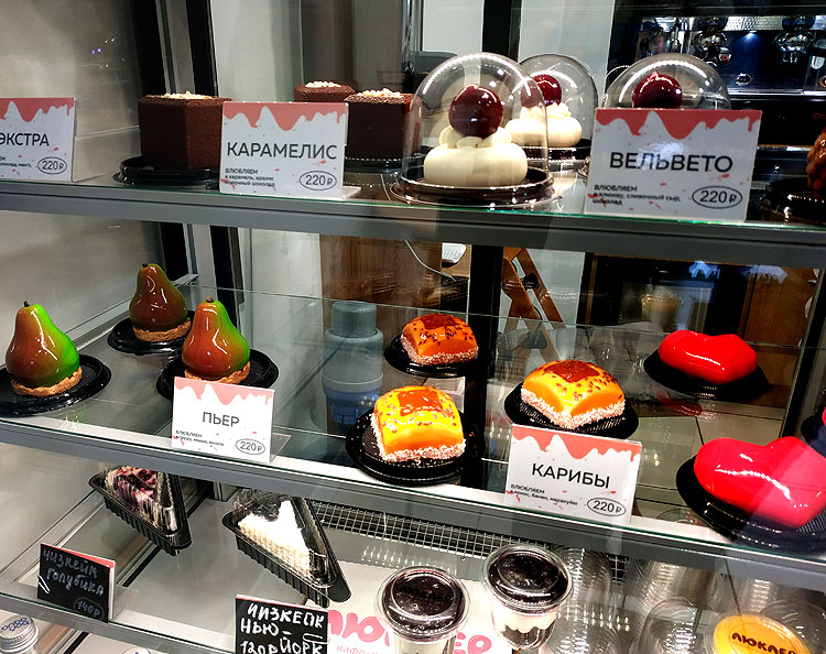 Вот это – пример витрины в той кондитерской, что в Камергерском. Если будете – десерт “Карибы” очень рекомендую. На Карибах ничего даже близко похожего по классности нет! (И тот что в виде груши – бомбический; конечно, если не вывели еще из ассортимента).