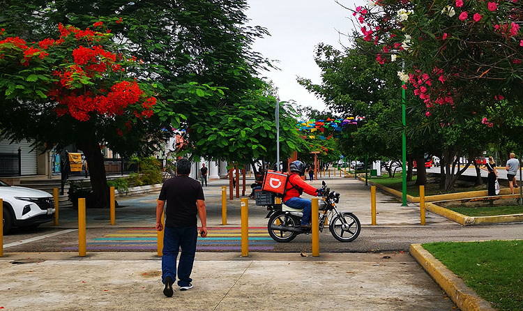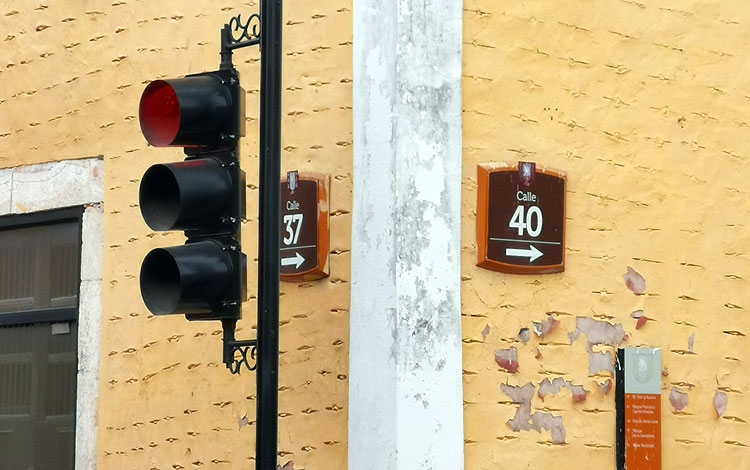 Моя головная боль. Односторонние дороги. Во всех городах, где мы были, очень много односторонних дорог. В некоторых городах выглядит так, что вообще только односторонние дороги. И довольно сложно следить, где односторонняя в какую сторону. Например, вот такое вы видите на любом перекрестке в штате Юкатан. Сообразили, да, куда вам можно, а куда нельзя?