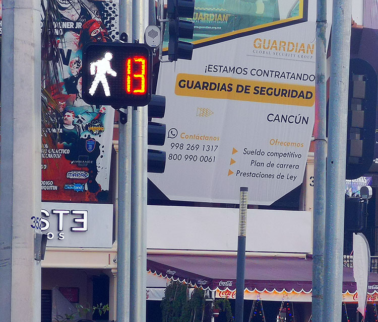 На красный мексиканцы не едут прямо, но направо поворачивают. В правилах такого нет. Но поворачивают направо все, и бибикают, если ты не. Но стоят на красный очень дисциплинировано. (Кроме мотоциклов в Мехико-сити. В Мехико мотоциклы стоят на красный только до тех пор, пока есть препятствия в виде других машин, пешики не считаются). Короче, когда машинам красный, переходить практически безопасно.
