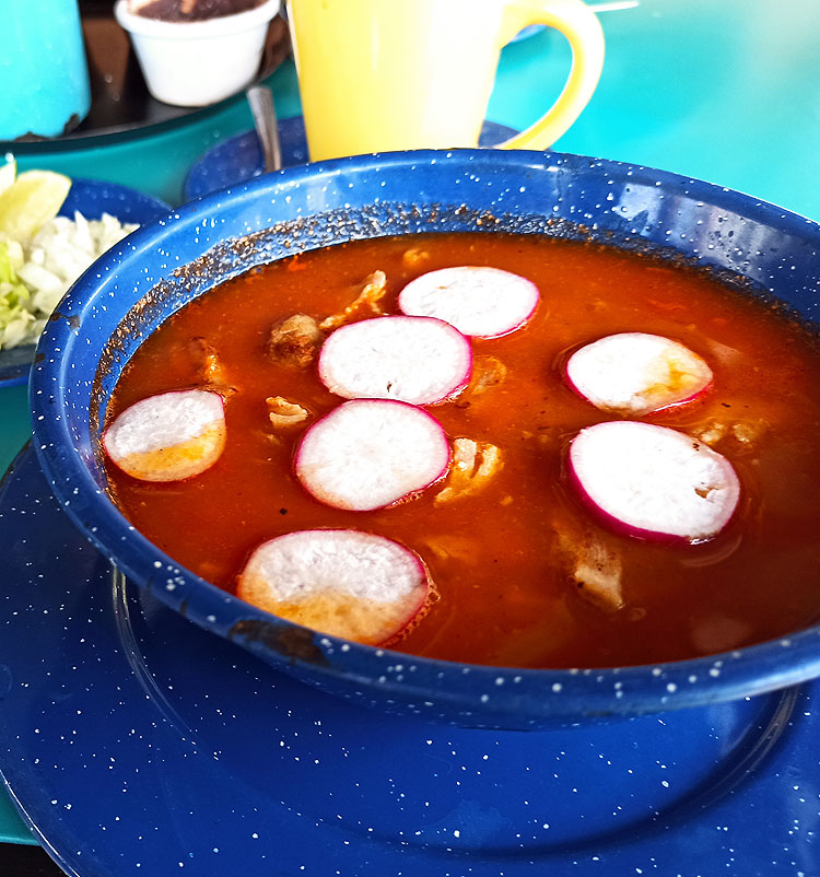 Посоле бывает трех цветов: красный, белый, зеленый (это цвета мексиканского флага). По вкусу практически идентичны, но по цвету – забавно. На фото оба раза красный, потому что красный встречается примерно в 70% случаев, белый еще 25%, и только где-то 5% приходится на зеленый.