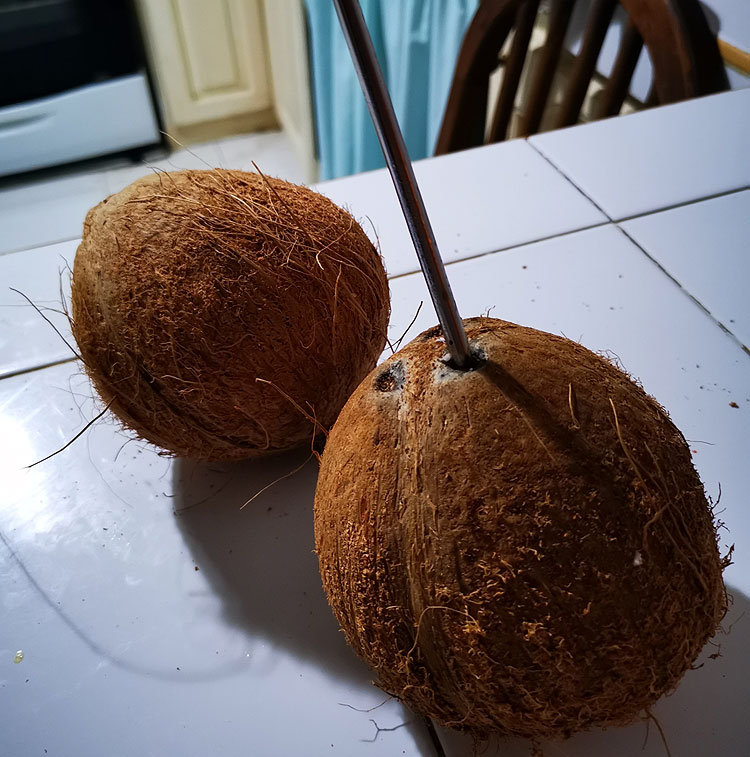 Кокосы первого вида. У них в темечке надо проколоть дырку, выпить, и когда уже жидкость выпита – их почистить: