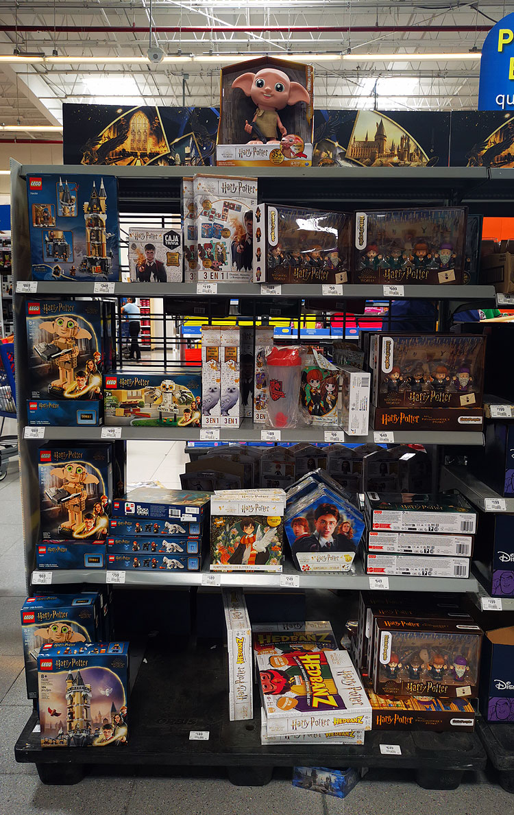 У нас сейчас две тематических стойки с мерчем: месяц прайда (поскольку Мексика очень яркая страна – могли бы отдельную стойку не делать. Она бледнее и менее мультиколор, чем стандартная выкладка товаров); и Гарри Поттер.