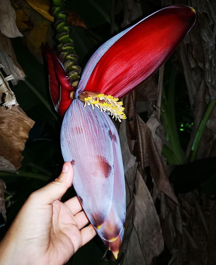 Банан. И вот нет, мне не кажутся цветы банана красивыми. Но они мне почему-то так нравятся. Они офигенные.