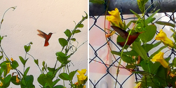 Несколько месяцев (где-то с марта по июнь) колибри не прилетали. Теперь опять каждый вечер, около 7, прилетает на ужин.