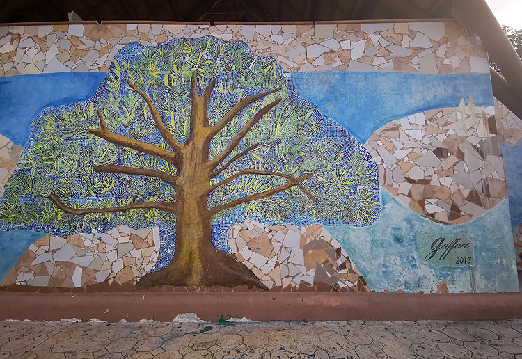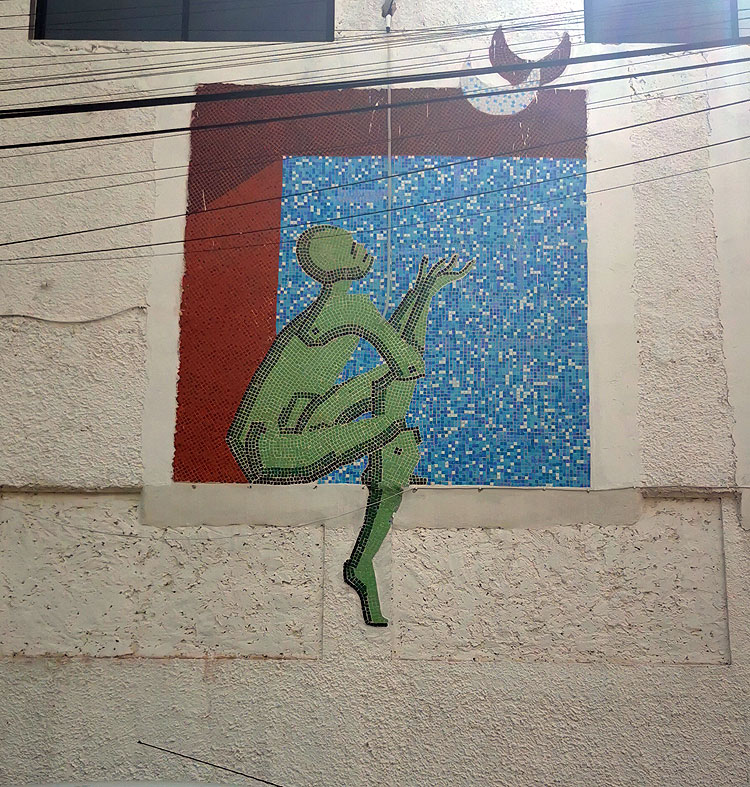 Подобного рода "фотообои" видели во многих городах, где были. - Немножко что-то советское есть, да? В этих граффити из плиточек.