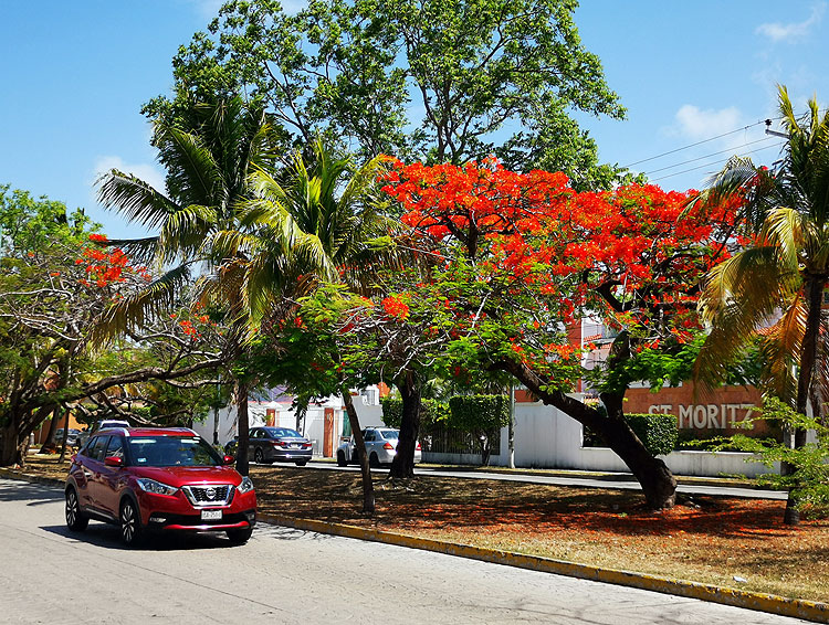 Канкун (как и большинство Мексики) зеленый всегда. И всегда цветущий. В каждом месяце года хоть что-то да цветет. Некоторые цветы (как стрелиция) цветут с перерывами круглый год, вне зависимости от сезона. Или бугенвиллея -- эта тоже круглый год красивая. А другие -- по сезонам. Скажем, делоникс -- летом, а табебуйя -- в конце зимы/начале весны, а драцена зимой. Ну, и так далее.