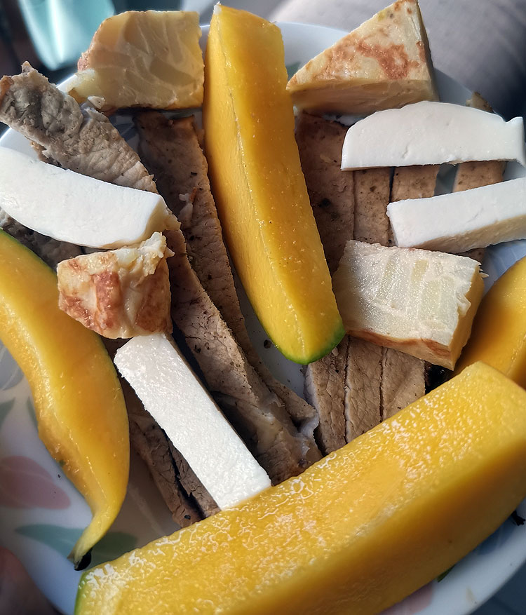Тортилью (испанскую) едят в двух ипостасях. Иногда это нормальная такая порция – полноценная еда. А еще ее разрезают на маленькие кусочки, и холодную едят как тапас. Вот я в Испании не могла понять, эту самую тортилью в виде тапас. А потом как поняла. Вобщем, тут у меня кусочки тортильи, манго, кусочки сыра, жареный кусок мяса типа чалагача опять порезанный на кусочки. Класс.