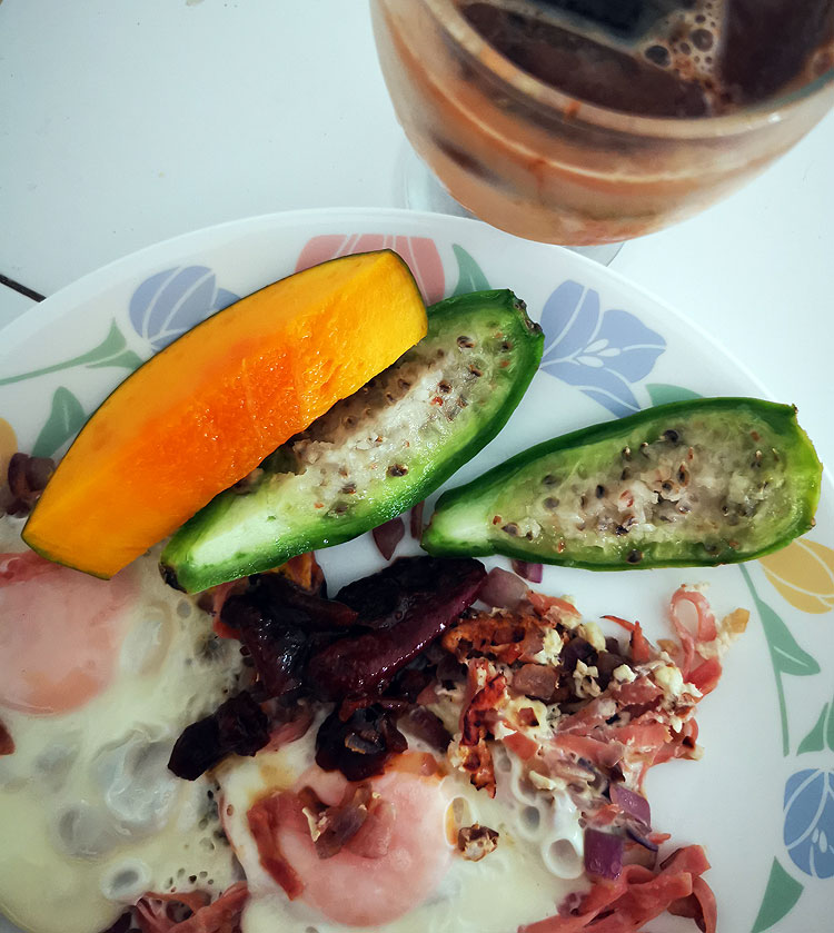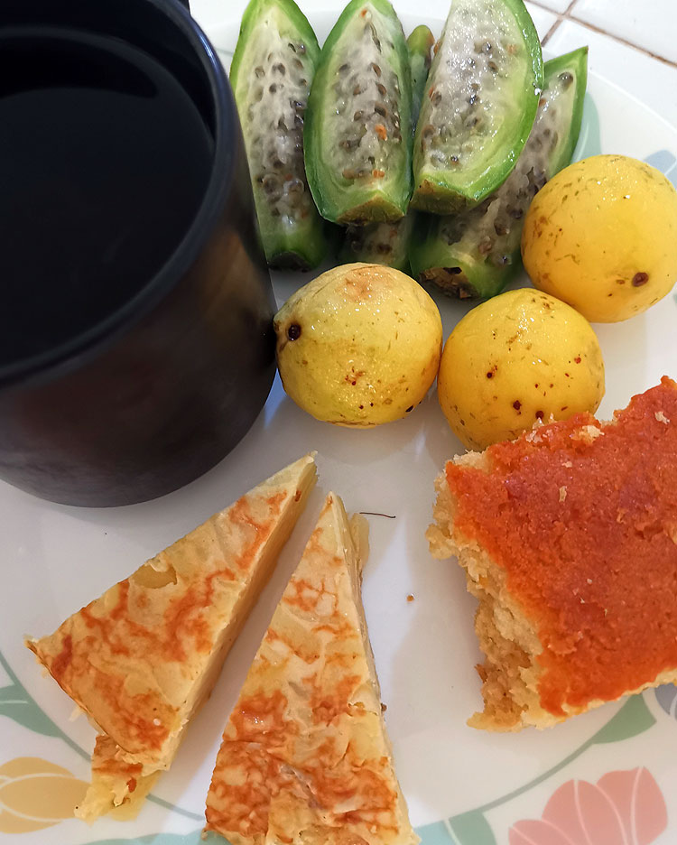 Это я себе на завтрак хотела кексик (называется “pan de elote”), а оказалось, что муж уже сделал на завтрак тортилью. Тут еще чай (потому что к кексику). А еще гуава и туна. Гуава у нас сейчас зреет на улицах (не в нашем дворе, но просто на улице). Туна тоже )
