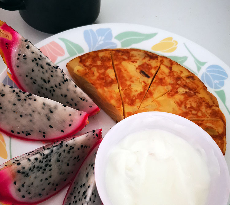 Вобщем, тут вы все сами видите. Испанская тортилья с йогуртом. И питахайя. Ну, и там чаек.