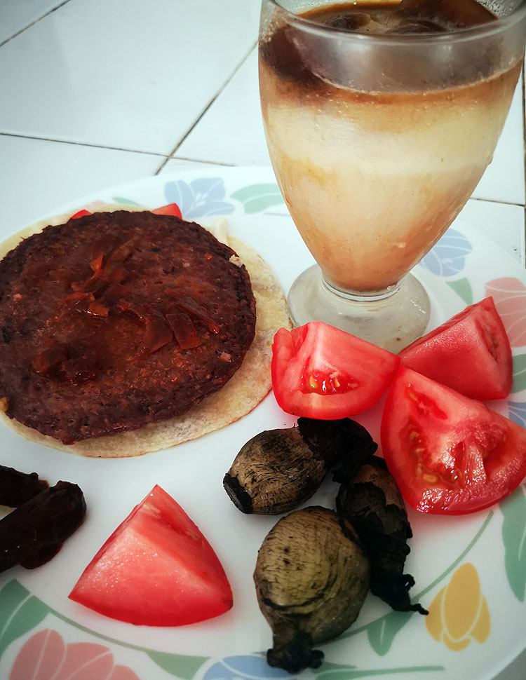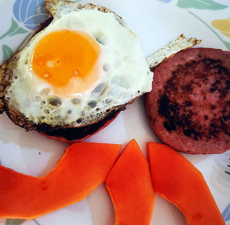 Котлеты из тунца. Тут у меня яичница – я ее использую к котлетам в виде соуса. Обожаю котлету макать в жидкий желток. )) Ну, и кусочки папайи. Что там за напиток был – осталось за кадром.