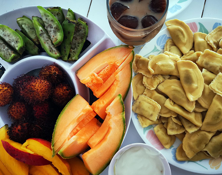 Но зато тут у нас еще айс-латте, и фрукты (рамбутан, манго, дыня и туна).