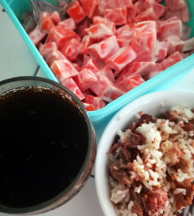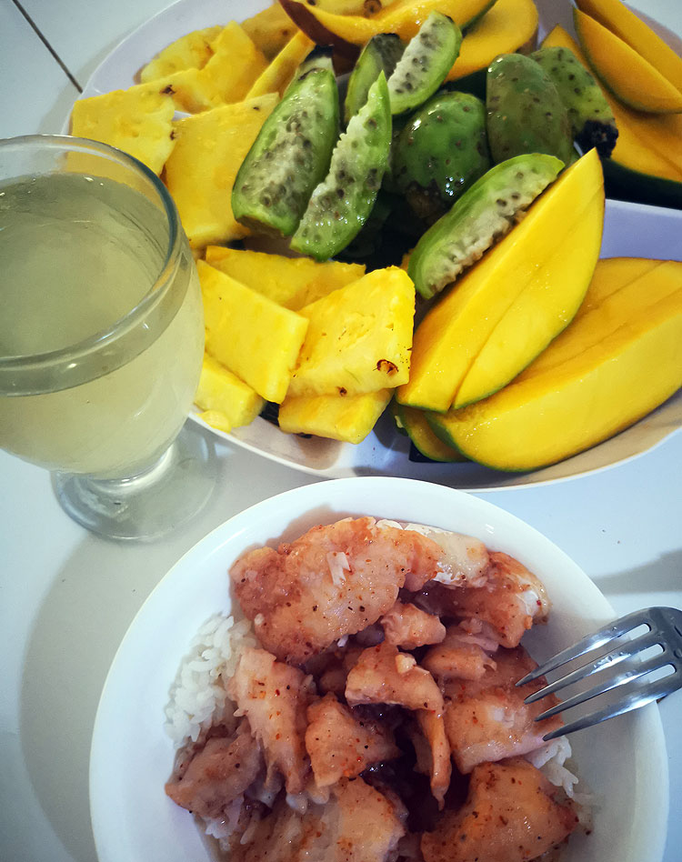 Тут лимонад (самодельный, из лаймов). Фрукты уже понятно: туна, ананас, манго. Рыбка в микроволновке (уже про такую писала) – и к ней там горочка риса. Потому что мне с гарниром вкуснее.