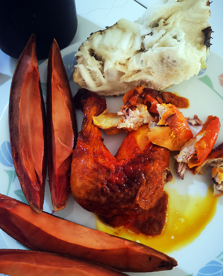 Опять анона. Мамей. И нога от курицы гриль. Ну, и там в кружке “Скуратов” точно мой любимый утренний кортадо.