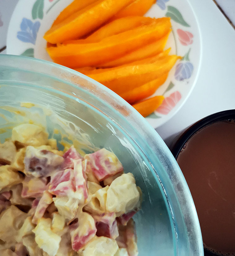 Здесь манго. Салат яичный (как в ураганный день). Ну, и кофе-кортадо.