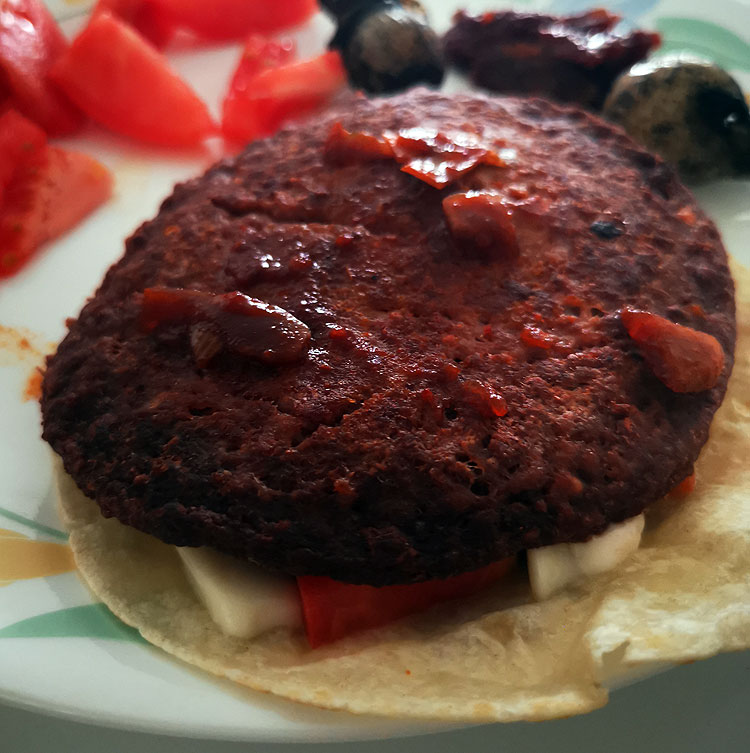 Котлету (котлета полуфабрикатная) обжарить с одной стороны, перевернуть, выложить сверху сыр, помидор и тортилью (лепешку; я тут купила маленькие, специально в размер котлет). Когда котлета обжарена со второй стороны – перевернуть лепешкой вниз. Сыр должен был чуть подплавиться уже – и слепить все это, чтобы не развалилось. Когда лепешка прожарится – переложить на тарелку, есть. Можно с ножом и вилкой, можно рукой. Котлету в данном случае обжариваю на сухой сковородке, так намного вкуснее. А когда уже штука на тарелке – выложить еще немножко порезанных перчиков-чипоттл.