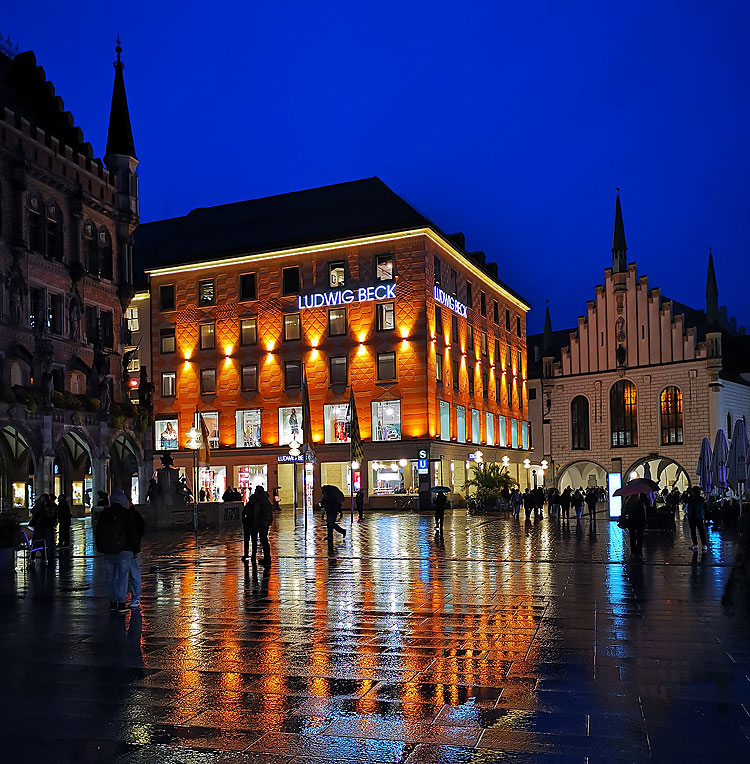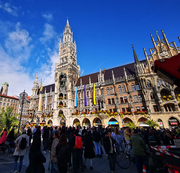 (Новая ратуша, на ней есть часы – они одна из главных достопримечательностей Мюнхена. В 11 часов (почему в 11???) на них танцуют фигурки, разыгрывая рыцарский турнир, вроде).
