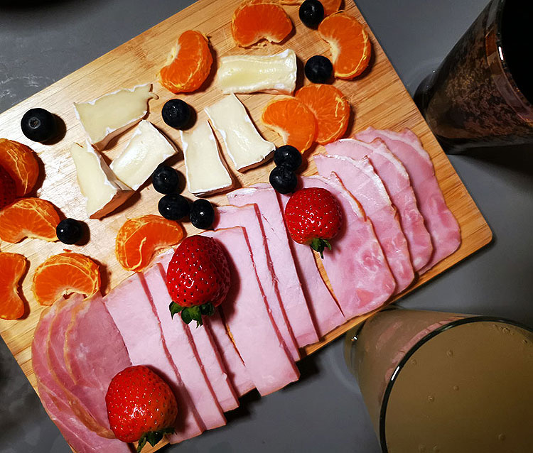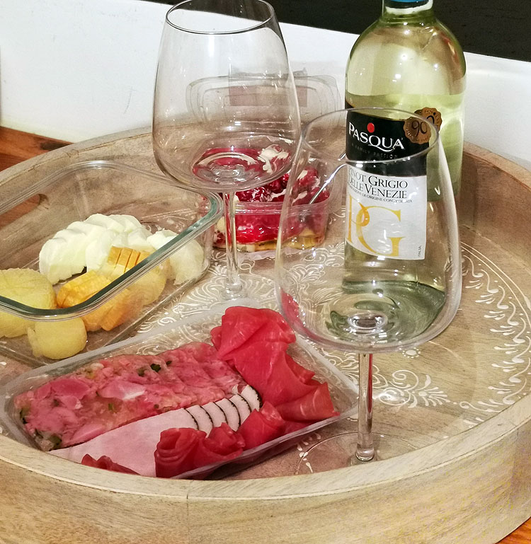 На фото закуска "перцы чили, фаршированные сыром", сырная тарелка, мясная тарелка. Ну, и вино. Кажется, это итальянское пино гриджио. Разных фруктов на фото нет -- но я уже писала, почему фрукты не будут попадать на фото ужинов из Германии.