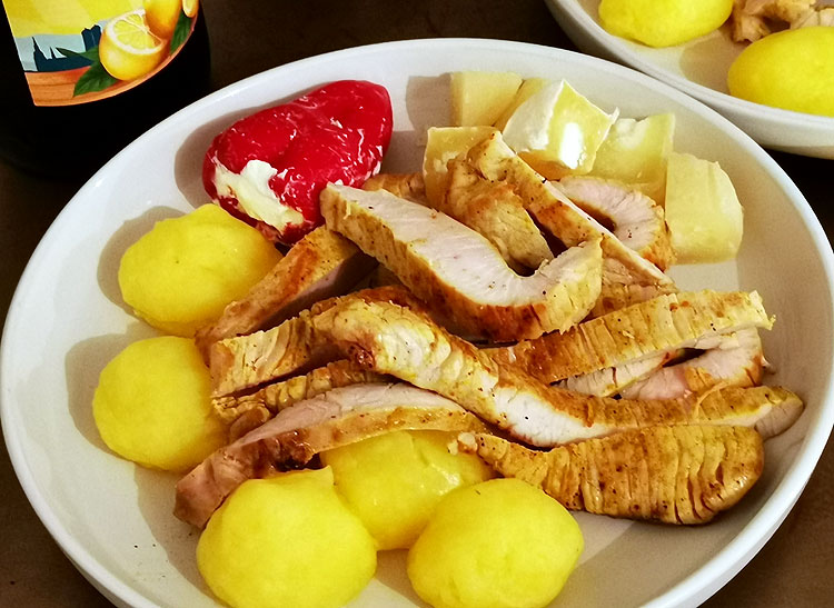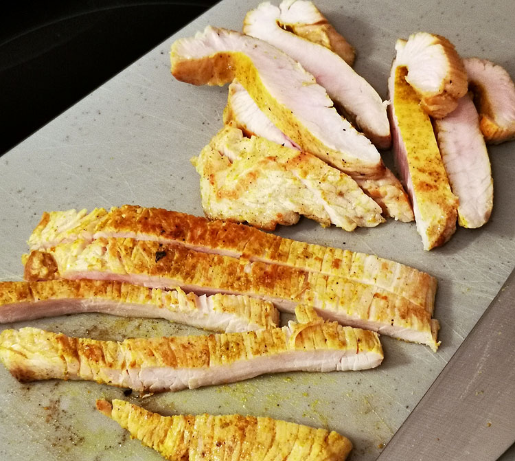 Единственное, что мне не очень понравилось – что курица порезана вдоль волокон. На фото это хорошо видно.