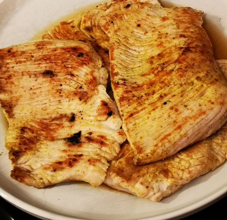 В качестве мяса в тот раз были из куриной грудки, кажется, которая порезана “на шницель”. На мой вкус на шницель надо еще отбивать молоточком. А я так просто пожарила (даже на сухой сковородке), вышло очень хорошо.