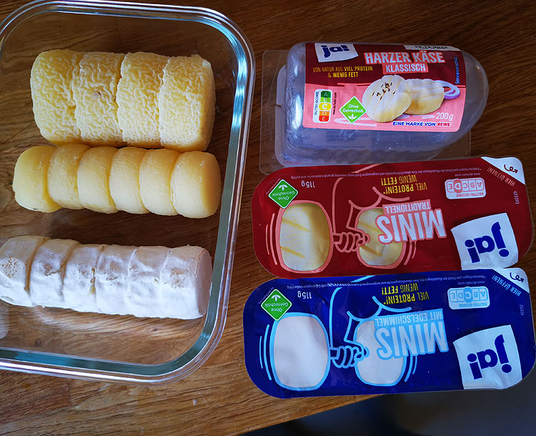 По наводке замечательной enka-letka мы обратили внимание на местный немецкий специалитет – кисломолочные сыры. Конкретно на фото: Handkäse (хандкезе, он же “ручной сыр” – можно почитать в Википедии) и Harzerkäse (гарцский сыр – можно почитать в Вики), но мы ели уже больше видов. Если будете в Германии – я настоятельно рекомендую попробовать такие сыры любителям необычных сыров, сыров с плесенью и сильнопахнущих сыров. Сыр очень необычный. Но мы от него в полном восторге. (Дополнительным бонусом то, что у них жирность менее 1% и калорийность 110-130 – я не думала, что бывают такие крутые сыры с такой жирностью) Сыр действительно пахучий. И вкус специфический. Думаю, понравится такой сыр далеко не всем. Но нам очень понравился.