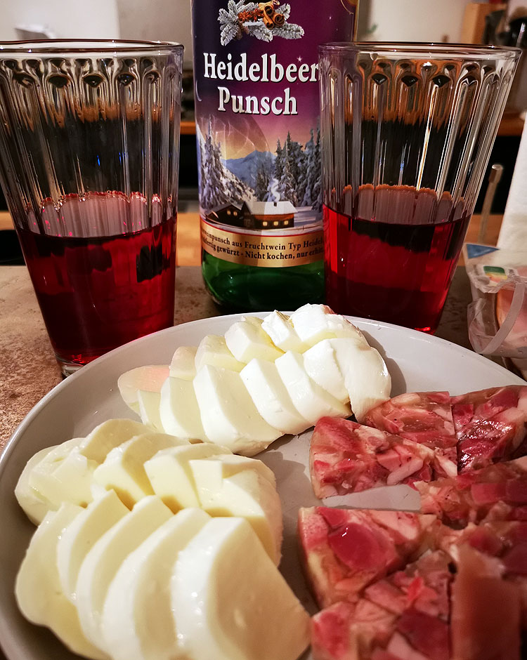 На фото все совсем просто. Пунш. Куплен прямо в бутылке, потом его надо нагреть. И я возвращаю пунш из кастрюльки, где грела обратно в бутылку, так пить удобнее. Чтобы пунш в бутылке меньше остывал, пока пунш греется, бутылка лежит в горячей воде -- тоже греется. Сыр -- моцарелла. И зальц. Или холодец. Или заливное. Не знаю, как правильно назвать.