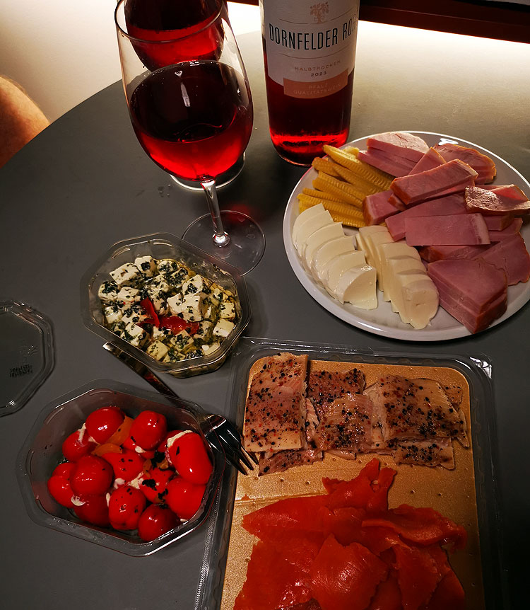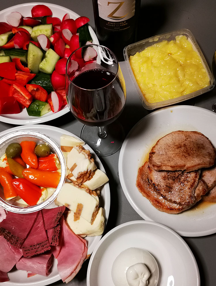 Кроме вина на фото: нарезка овощей (редиска, огурец, перец), опять фаршированные чили, картофельный салат (пока покупной, но очень хвалила немецкая фрау в магазине), буррата и стейки я по-быстренькому пожарила.