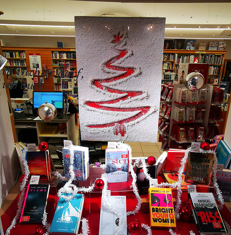 - Ну, и книжные магазины не отстают. Тоже украшают витрины по-новогоднему.