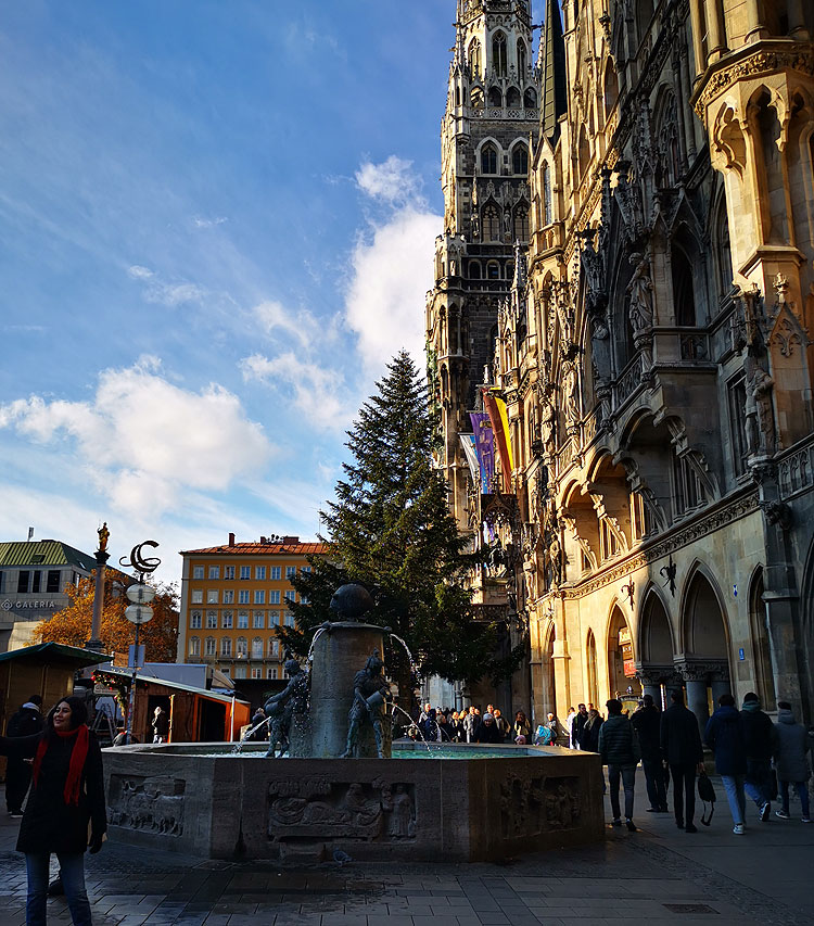 Главная елка Мюнхена. Я ее уже показывала -- но меня каждый раз радует, что рождественская елка одновременно с работающим фонтаном. Хотя после Мексики могла бы и привыкнуть.