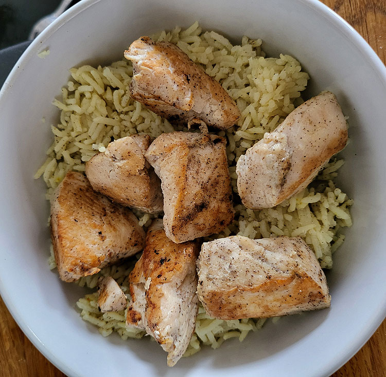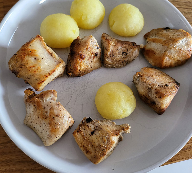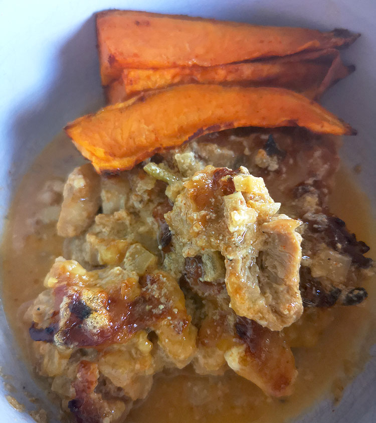 Как раз со свинятиной мне французское мясо не очень: жирновата. Здесь у меня вообще куриная грудка — и это абсолютно не сухо.