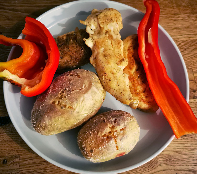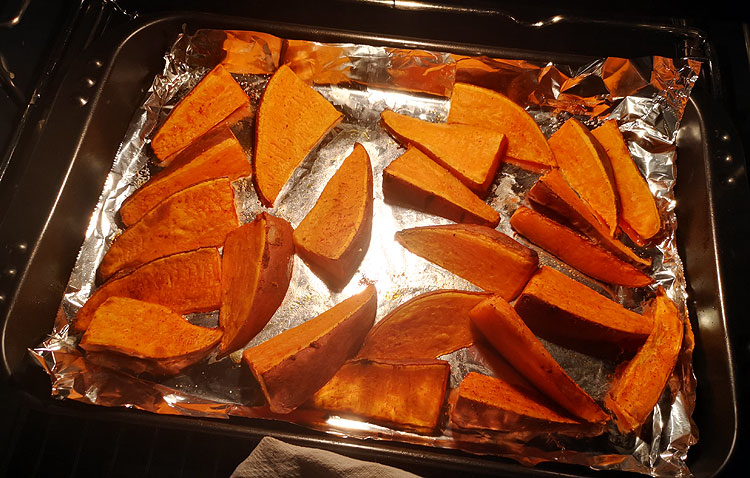 Короче: порезать батат на дольки, смазать солью с перцем, если совесть позволяет – побрызгать маслом из баллончика. Запекать минут 25 – периодически вилкой тыкать, проверять готовность.