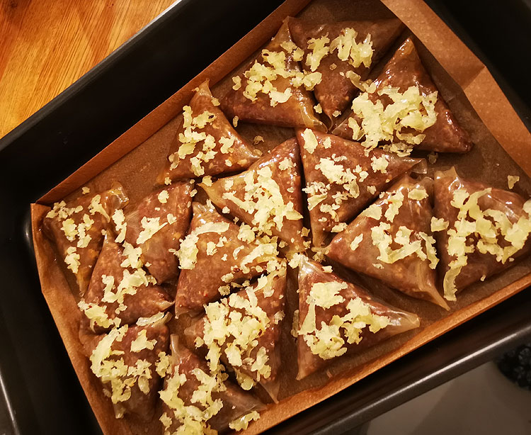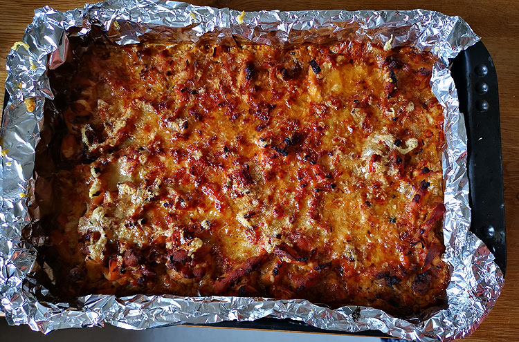 У меня очень большие противни, и есть формочка для хлеба (но она была маловата), а средних сейчас нет. Поэтому соорудила внутри противня форму из фольги, которая мне лучше подошла по размеру. Я люблю, когда запеканка не очень высокая: максимум сантиметра два.