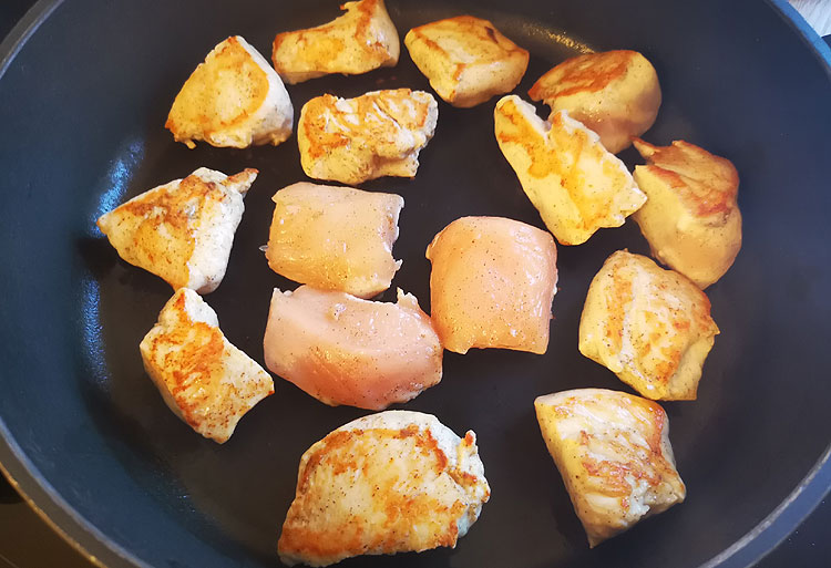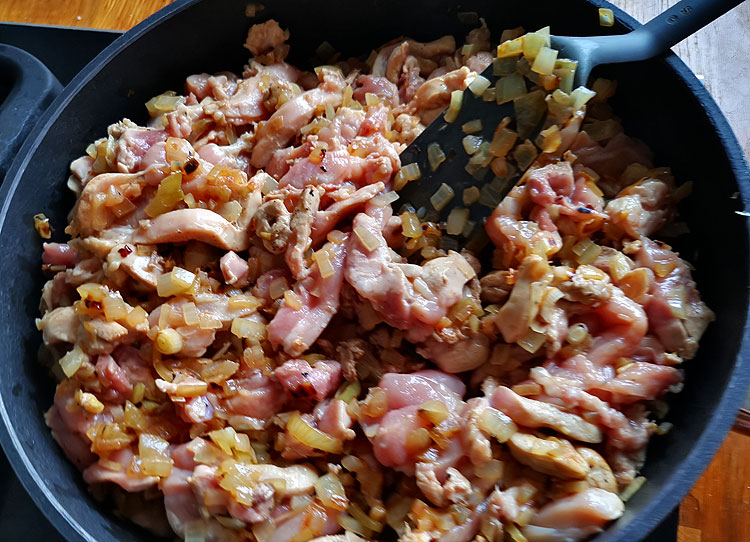 Короче, готовлю я так. Нужно мясо, порезанное кубиками некрупно (у меня было покупное порезанное мясо курицы – традиционно нужна говядина). А вообще, в целом, мясо по-французски это специальный рецепт для советской говядины, который даже из подошвы от ботинок сделает что-то жующееся и сочное.