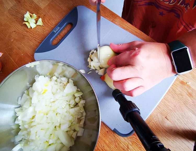 Мне осталось нарезать только лук. Чем мельче – тем лучше.
