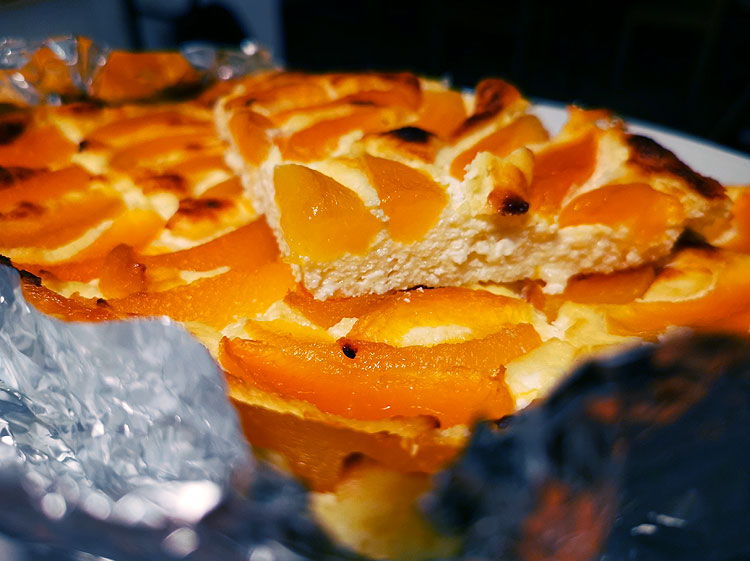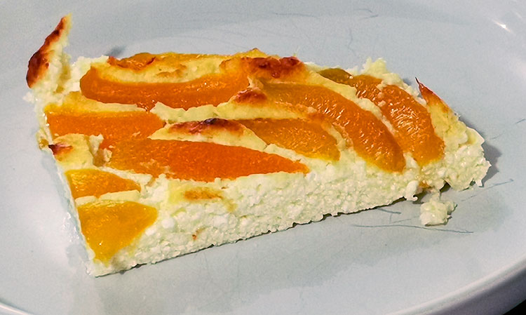 Про запеканку. Мне нравится запеканка, даже когда творог странный. Здесь творог неплохой, на мой вкус. А еще, по-моему, если творог чем-то не устраивает, то вот дольки персиков (или как в моем случае абрикосов) – очень спасают весь десерт!