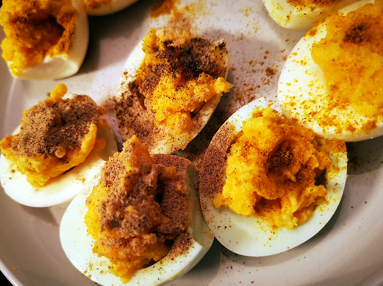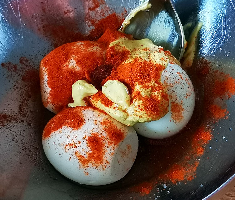 На 4 яйца нужна 1-2 столовые ложки лимонного сока. 1 столовая ложка растительного масла. 1 столовая ложка воды 1 столовая ложка с горкой горчицы. пара зубчиков чеснока -- через чеснокодавку. Соль, сахар (сахарозам), перец по вкусу. (Например, всего по чайной ложке)