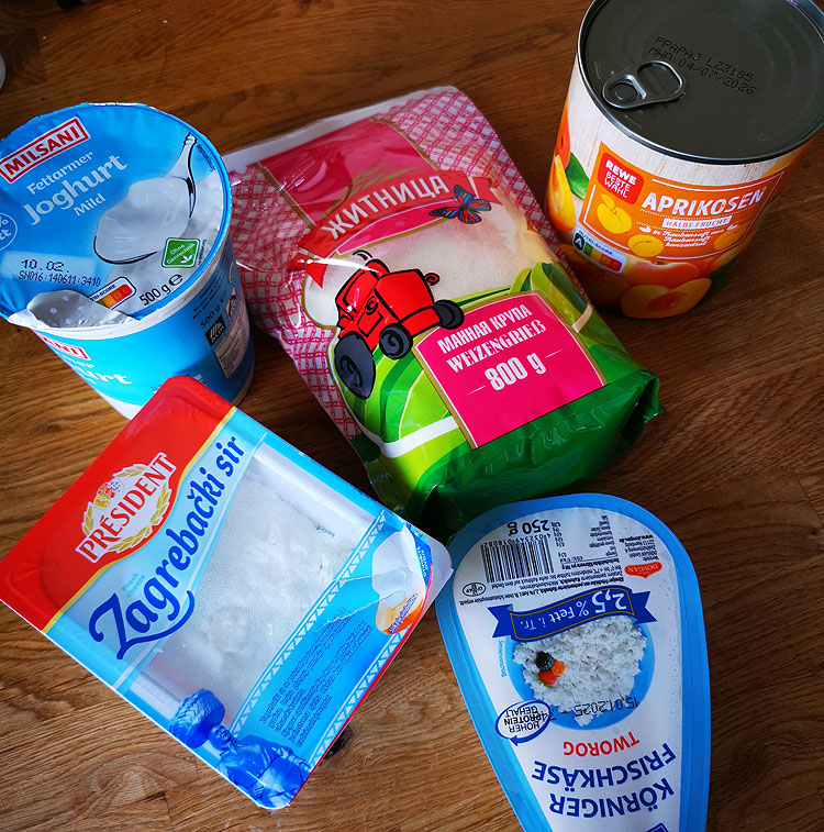 Творог (у меня одна пачка -- русский творог, одна -- хорватский). Йогурт (или сметана) -- пара столовых ложек. Манка -- столько же. Яйцо -- 1 шт. Разрыхлитель -- опционально, 10 г. Сахар или подсластитель -- по вкусу. Наполнитель. У меня в этот раз -- консервированные абрикосы.