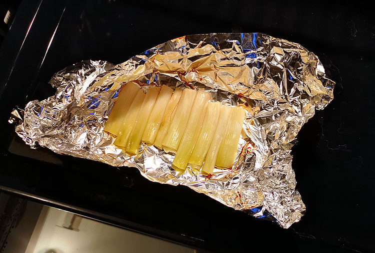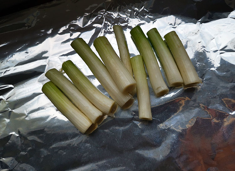 Белую часть от зеленого лука – в духовку. (Если вы на природе жарите шашлыки – еще лучше. На решетку его над углями). Через какое-то время он станет мягкий, его достать.