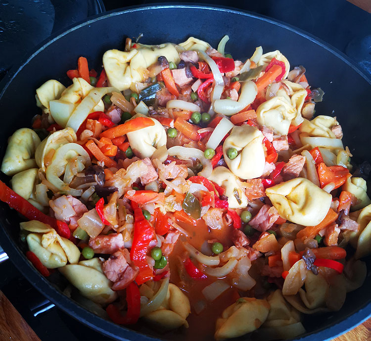Это блюдо в моей семье называется “либо-либо”. Нужна смесь овощей (я беру в магазине произвольную замороженную пачку, которая нравится по составу), что-то типа сосисок, что-то типа пельменей-равиоли. Ну, и соус, если какой завалялся от доставки – туда же.