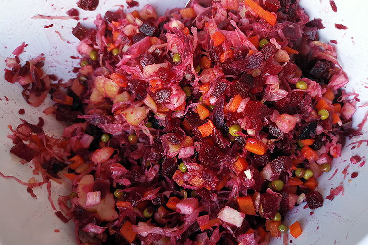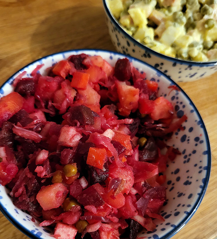 Винегрет тоже готовила на Новый год. Муж очень просил. И вот выходит так, что последние уже несколько лет у нас на Новый год -- не оливье, а винегрет. Не знаю, почему так. Но вообще, винегрет у меня обычно очень вкусный. В прошлом году была нестандартная мексиканская версия, а в этом году -- очень стандартный советский винегрет.Главную роль в винегрете играет свекла. Еще нужна морковка и картошка. Эти три овоща – запечь в духовке. (Просто выкладываем на фольгу и печем. Учтите, что картошка печется быстрее всех).