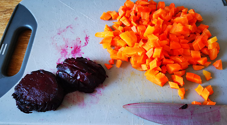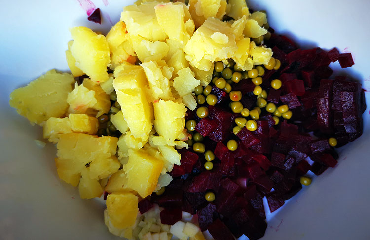 Режем кубиками свеклу, морковку, картошку, добавляем соленый огурец (опционально) и зеленый горошек (опционально).