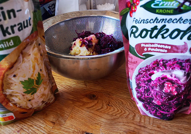 В Германии никакого резона самой квасить капусту для винегрета нет. Это как в Тулу со своим самоваром. Разных кислых капуст до фига, и все они реально очень разные. Я взяла вот такую белую – она горько-кислая, хорошая. И вот такую красную – она сладковатая. Кстати, чуть не забыла. И из горошка, и из огурцов, и из капусты – слить лишнюю жидкость.