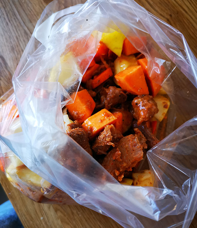 В пакет для запекания сложить овощи (у меня морковка, батат, свеколка, лук – полукольцами, но в целом можно любые. Главное резать не очень мелко, крупнее мяса). Мясо, порезанное кубиками, тоже сложить. Посолить, поперчить, лаврушку.