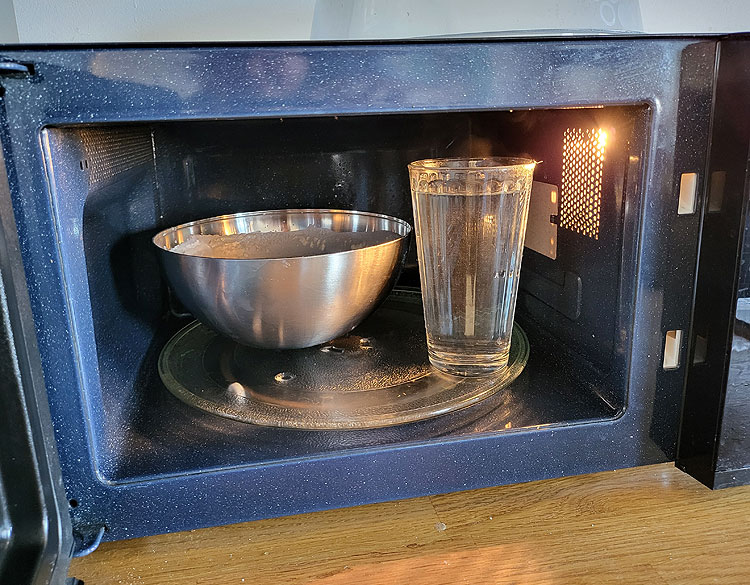 Лайфхак такой: ставим миску с опарой (на втором этапе: с тестом) в микроволновку, и рядом ставим стакан с горячей водой. Можно горячую воду из-под крана. Микроволновку не включаем, просто закрываем. Там почти герметично – и пар согревает среду. Если стакан с горячей водой не влезает – не страшно. Можно нагреть воду до кипения в микроволновке, а потом туда запихать тесто и закрыть.